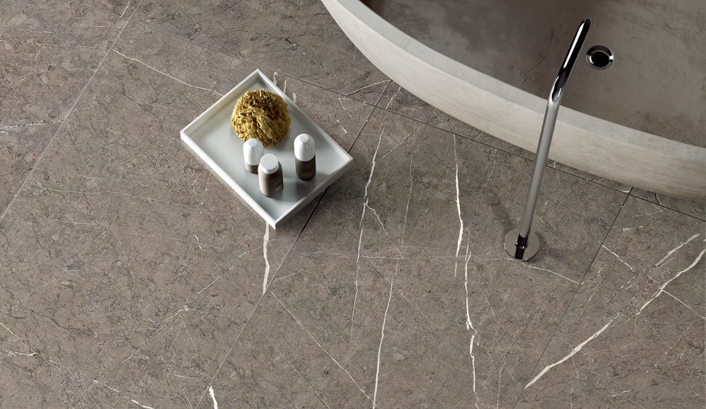 Pietra elements are derived from the precious natural marble of Turkey, with thick and subtle veins intersecting with shading. It replicates the lightning-delicate white classic root pattern of natural stone, adding a le